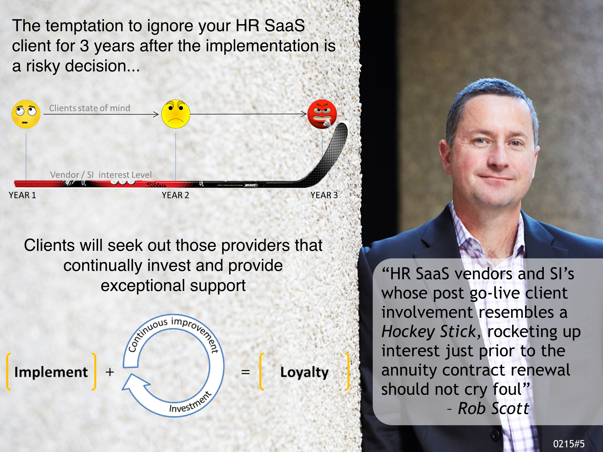 Ultimately the client will decide to stay with a product/vendor based on their experiences with the SaaS product, vendor and SI’s as well as any broader technology objectives and strategies. While ERP implentations provide lengthy on-site opportunities to develop deep and trusting relationships and easily positioning the next piece of work, the SaaS approach doesn’t. If the vendor and/or SI have been the proverbial ‘Hockey Stick’ and not actively and regularly engaging with their clients through high quality 24/7 support programs, continuous improvement initiatives, thought leadership exposure and robust future design and strategy workshops, then they are at risk of loosing clients, and deservedly so.